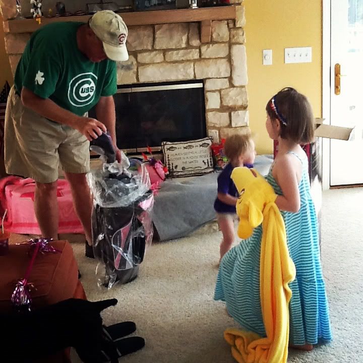 We got to Grandpa and Grandma's lake in Michigan yesterday and are enjoying some extremely warm weather. I forget what humidity feels like! Maria got a set of golf clubs from Grandpa for her birthday. Pink!